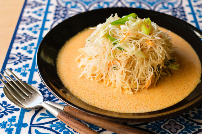 カレーが日常食のスリランカでは、カレーのソースにストリングホッパーと呼ばれるビーフンをつけて食べる文化があります。この食文化を参考に、日本らしく焼ビーフンをご飯に見立て、カレーを合わせて食べる「ビーフンカリー」が誕生しました。ビーフンとの相性を追求したスパイスカレーと、ビーフンが絡んでますます美味しいケンミンの焼ビーフン。